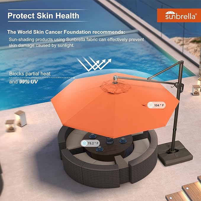 - This cantilever umbrella has unique handle design with 5 tilt positions, and 360° rotation allowing smooth adjustment to the sun's changing angles.