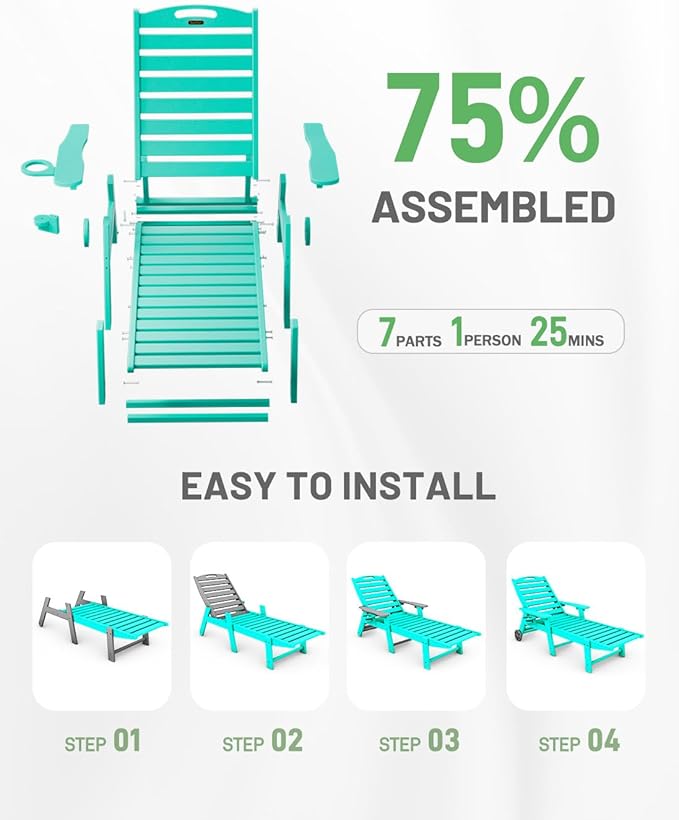 - Premium Suunyn HDPE: The polywood chaise lounge are made from high-density HDPE, which bends slightly under heavy weight or high temperature but returns to its original shape when the weight is removed or the temperature has dropped. This durable material withstands harsh weather and is easy to clean