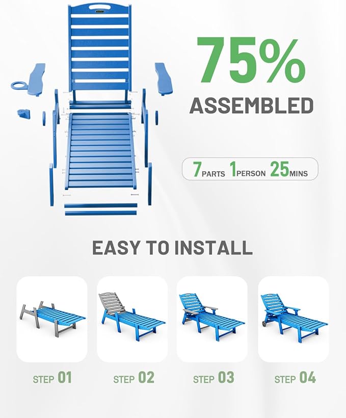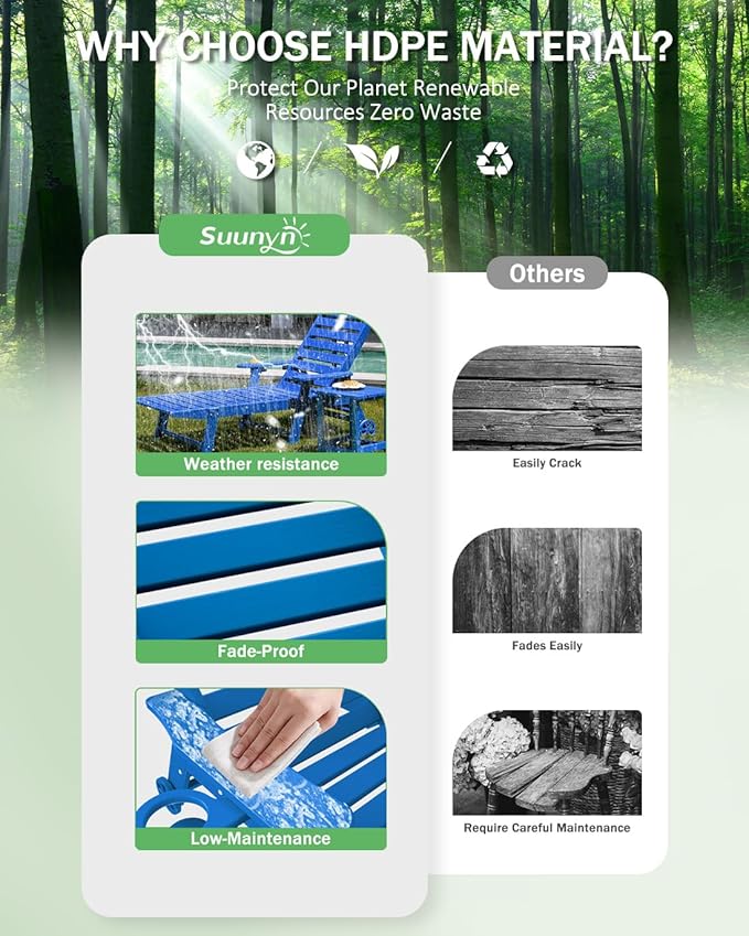 - Premium Suunyn HDPE: The polywood chaise lounge are made from high-density HDPE, which bends slightly under heavy weight or high temperature but returns to its original shape when the weight is removed or the temperature has dropped. This durable material withstands harsh weather and is easy to clean