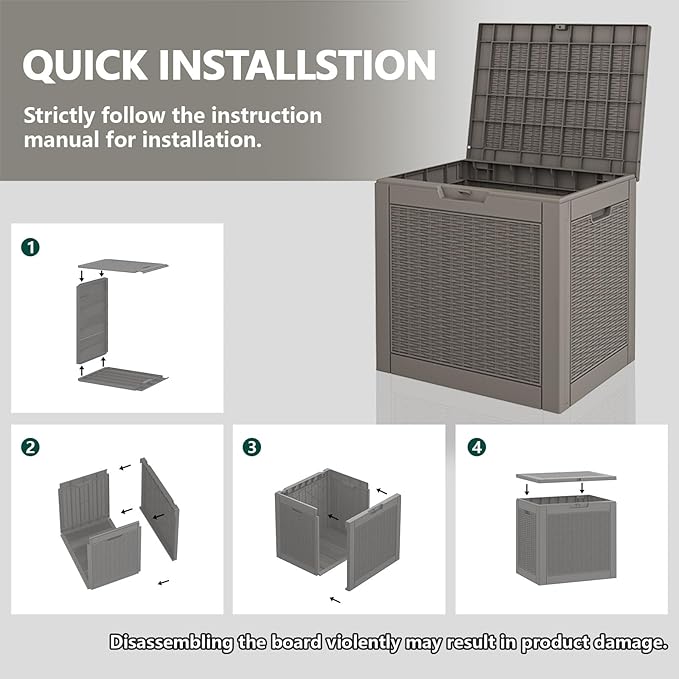 - đ§ăTOOL-FREE ASSEMBLY IN MINUTESă No extra tools, no hassle â this outdoor storage box features a snap-fit design that lets you assemble it in about 10 minutes. Perfect for quick setup so you can enjoy more time organizing and less time working.