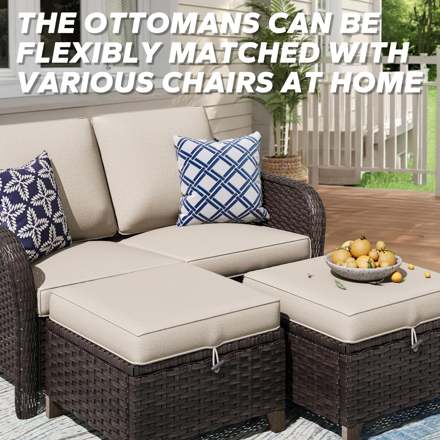 2 Pieces Patio All-Weather Wicker Ottomans with Cushions, PE Rattan Outdoor Conversation Furniture Set for Backyard, Deck, Lawn (Beige)