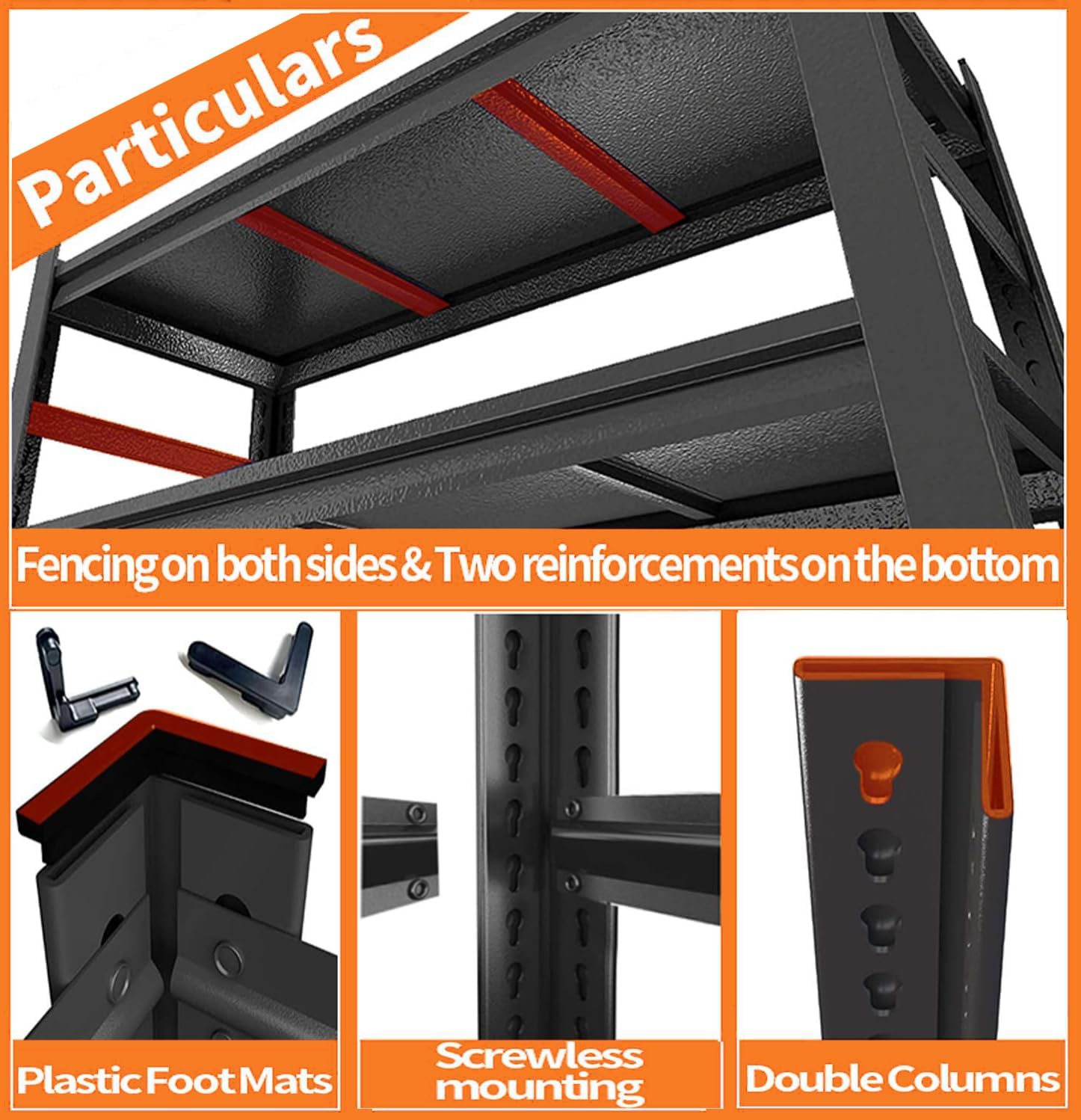 - γThe double-layer column design provides enhanced stabilityγThis Storage Shelves features a double-reinforced column structure, with support ribs on each tier to enhance overall stability. Constructed with a high-strength steel frame and durable steel panel shelving, this 5-tier Shelving unit offers reliable load-bearing capacity and is suitable for safe storage of various items.