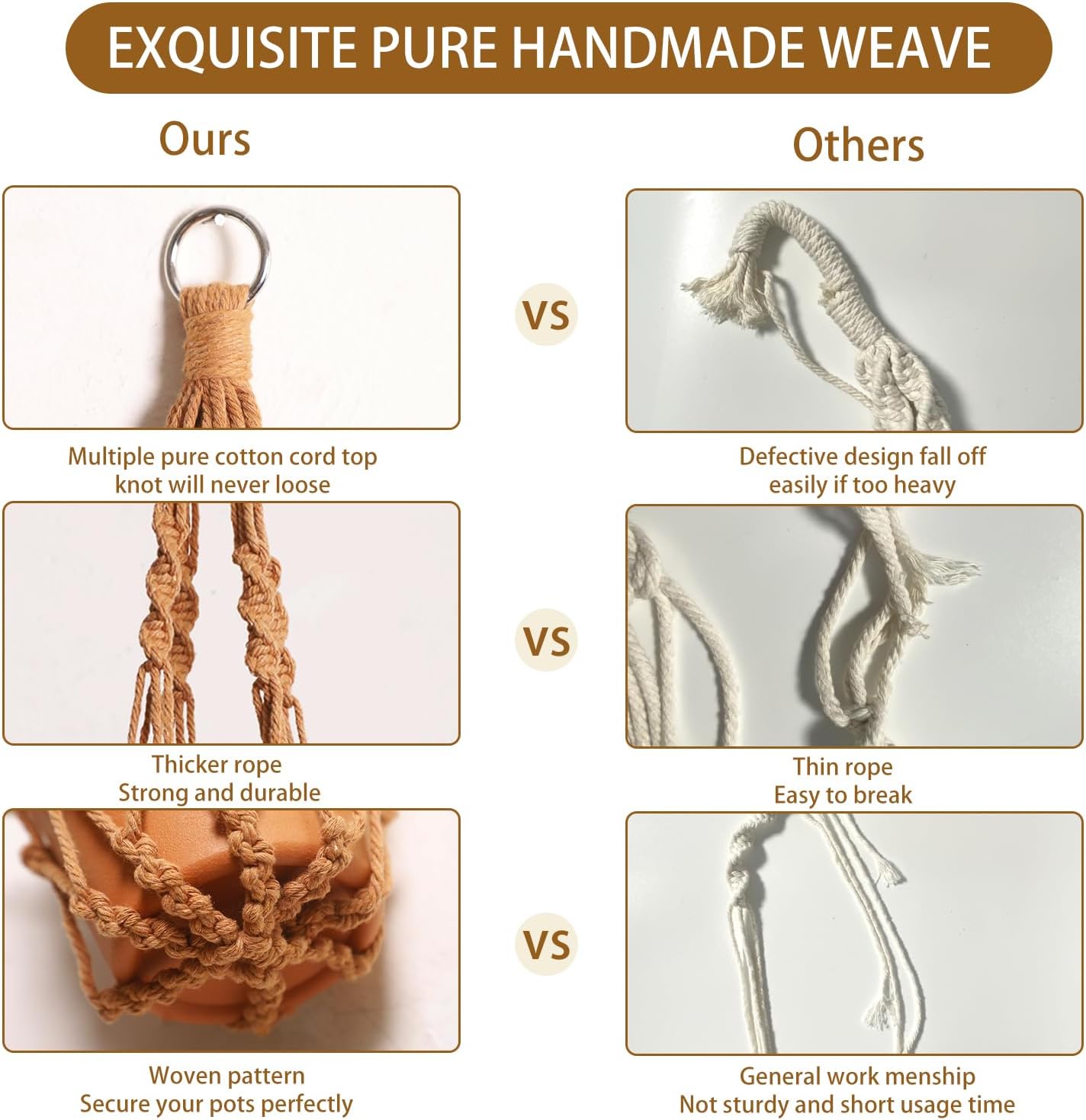 • HANDMADE WEAVING CRAFT - Hanging plant holders made from eco-friendly recycled cotton rope and metal ring, It has a strong flexible woven design, sturdy and durable, accommodates planters of all shapes and sizes, you can take them home for your plants with confidence